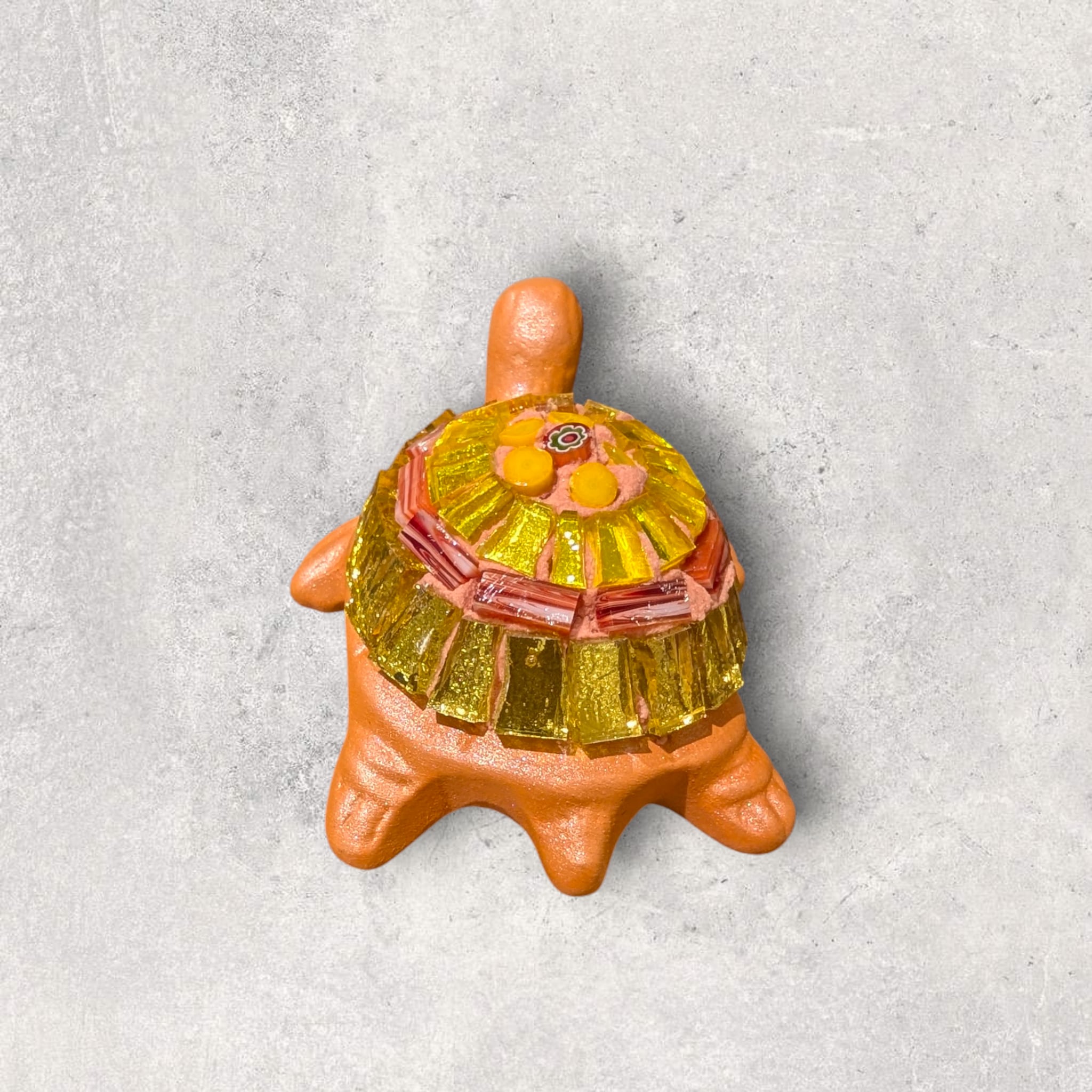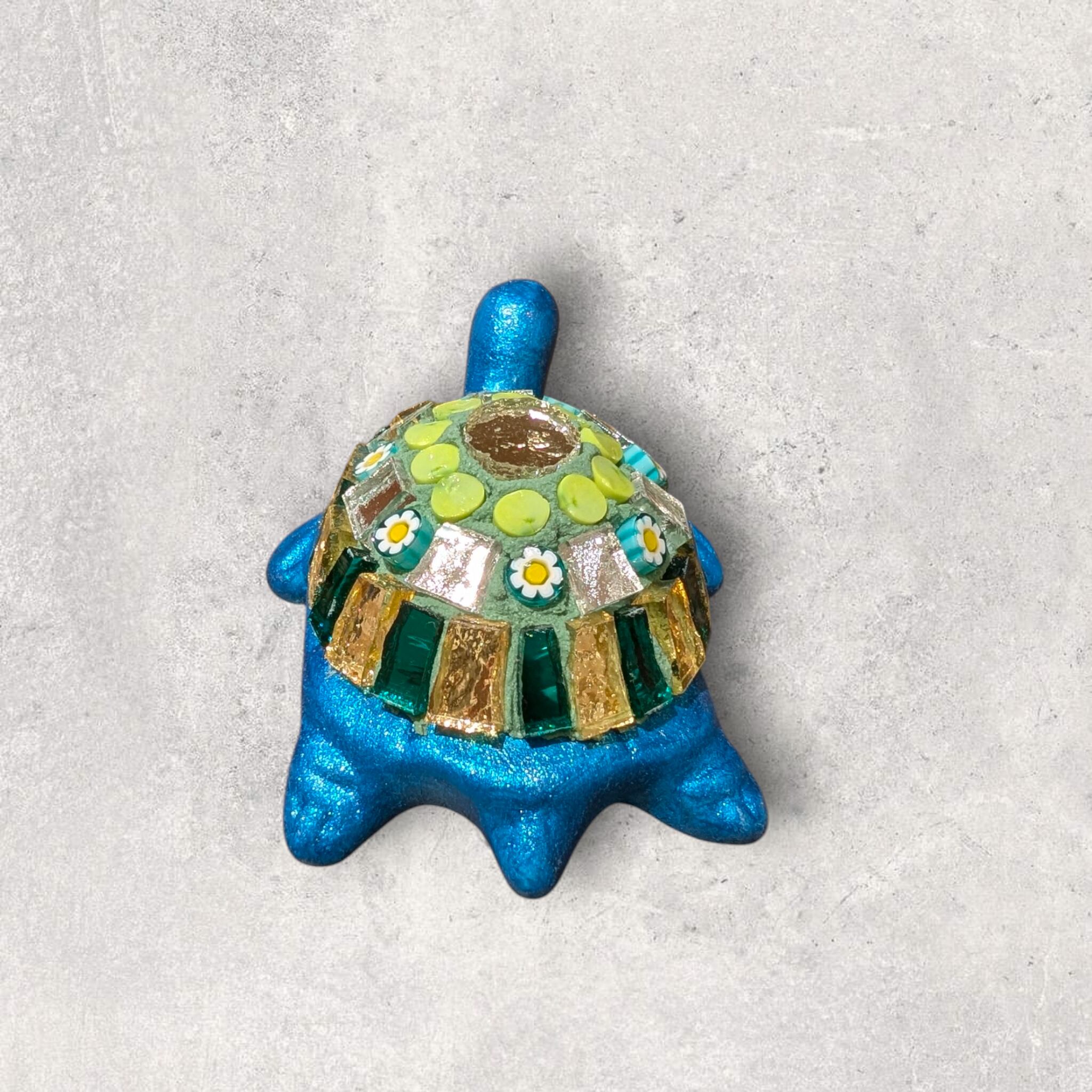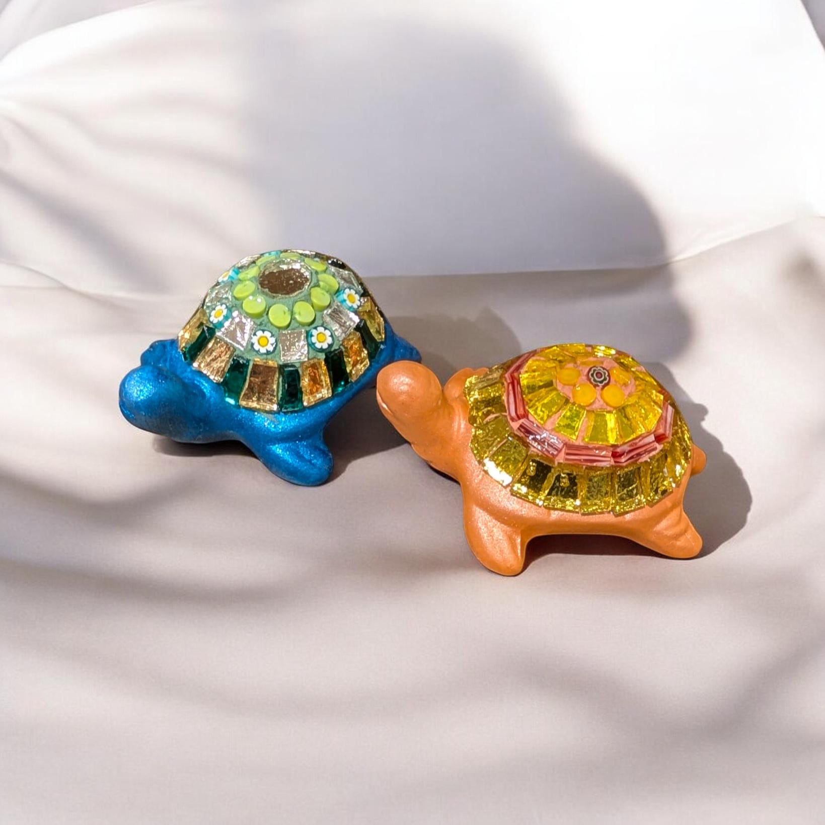 甲羅にはめ込まれたモザイクがキラキラと存在感を放つ一品となっております。カラフルな色使いは、見る人を魅了します。