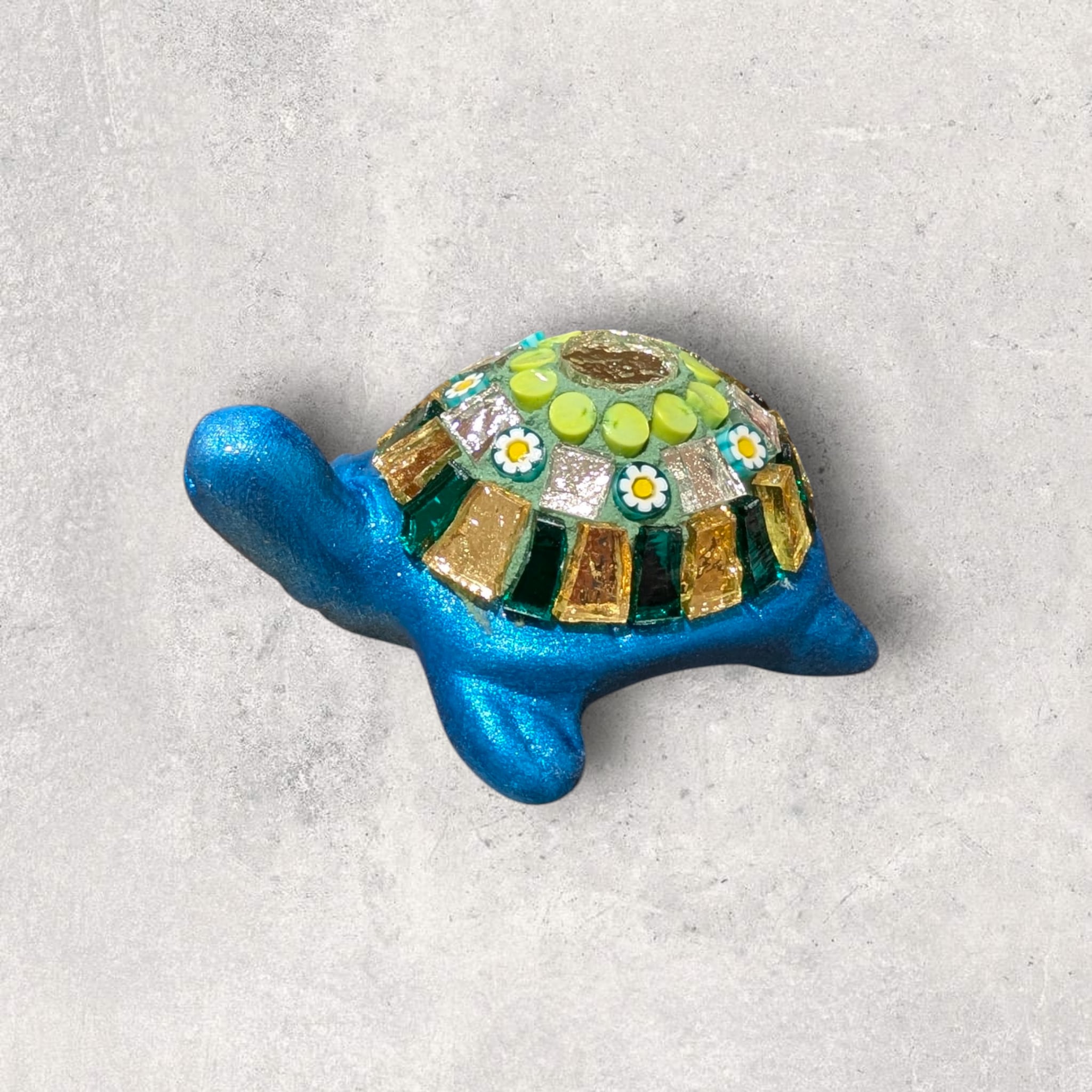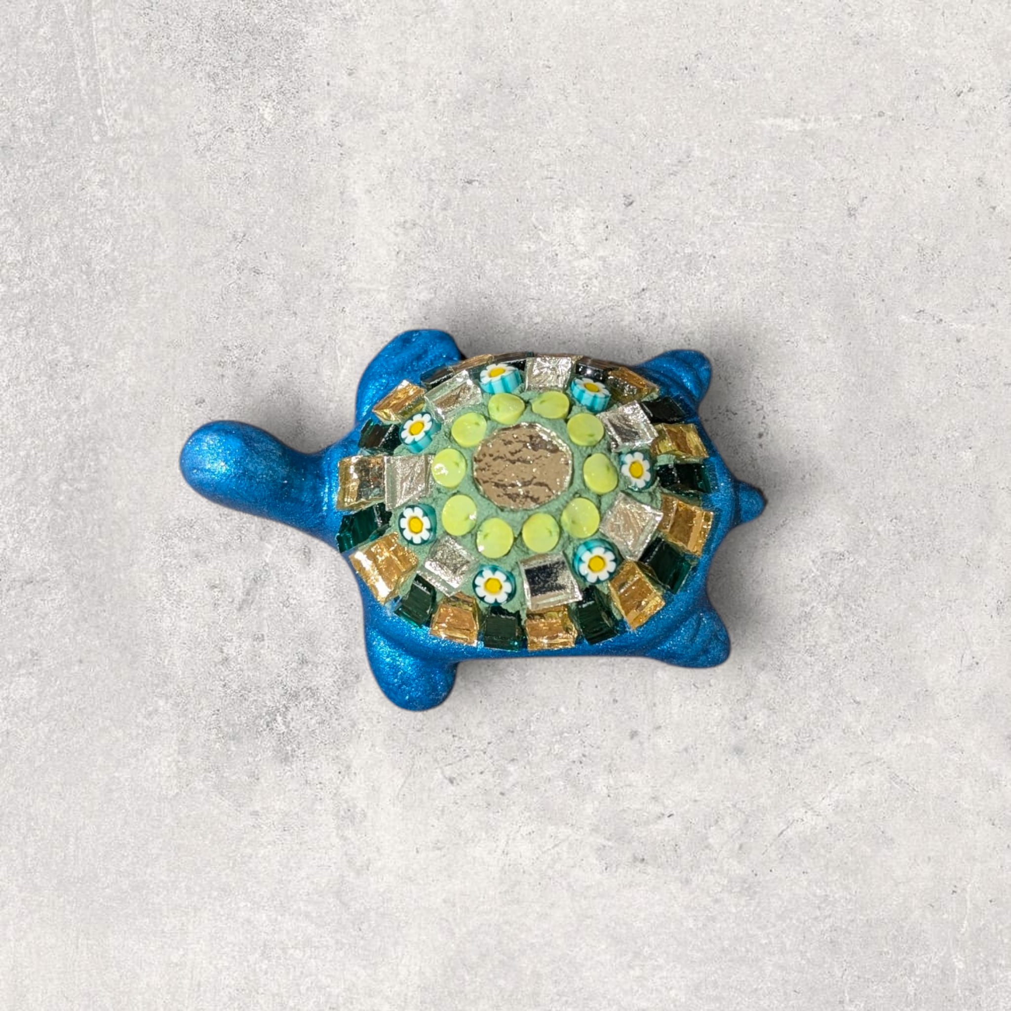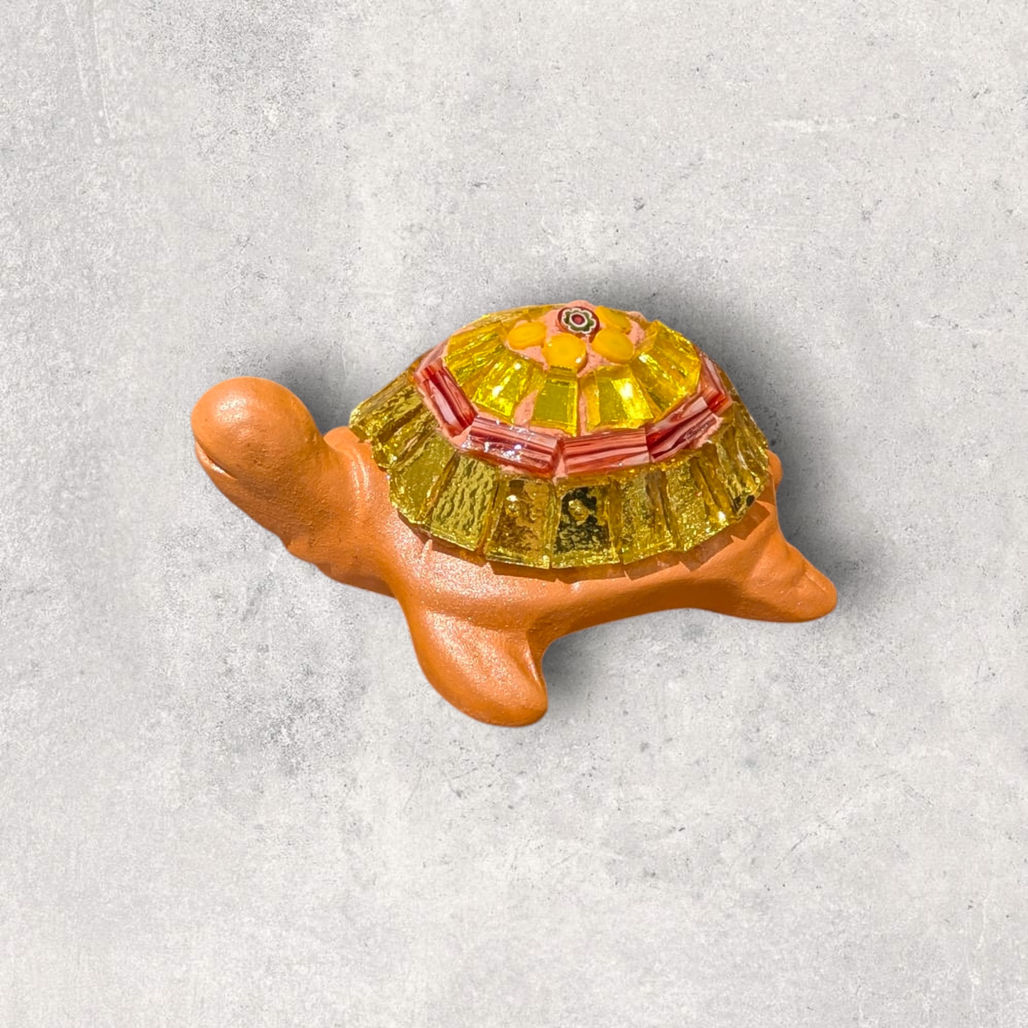甲羅にはめ込まれたモザイクがキラキラと存在感を放つ一品となっております。カラフルな色使いは、見る人を魅了します。