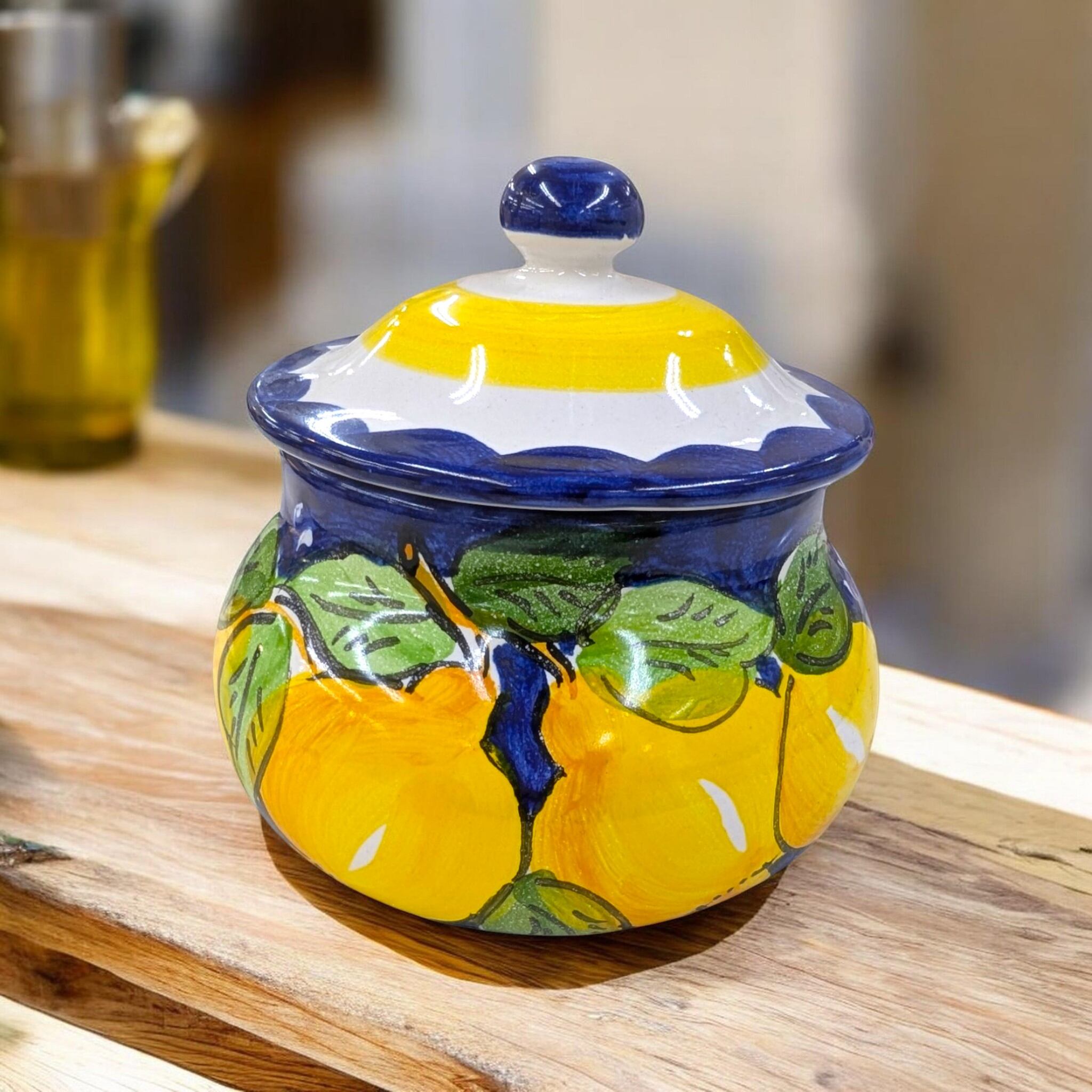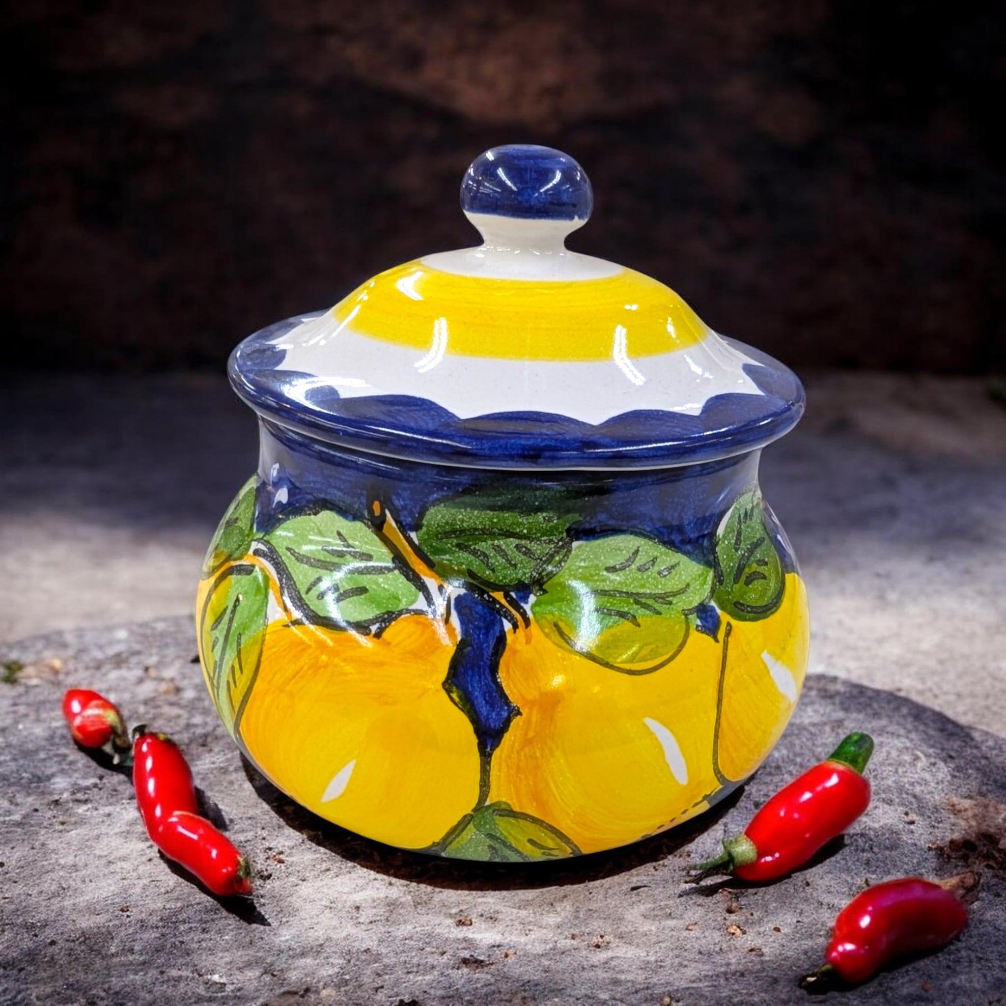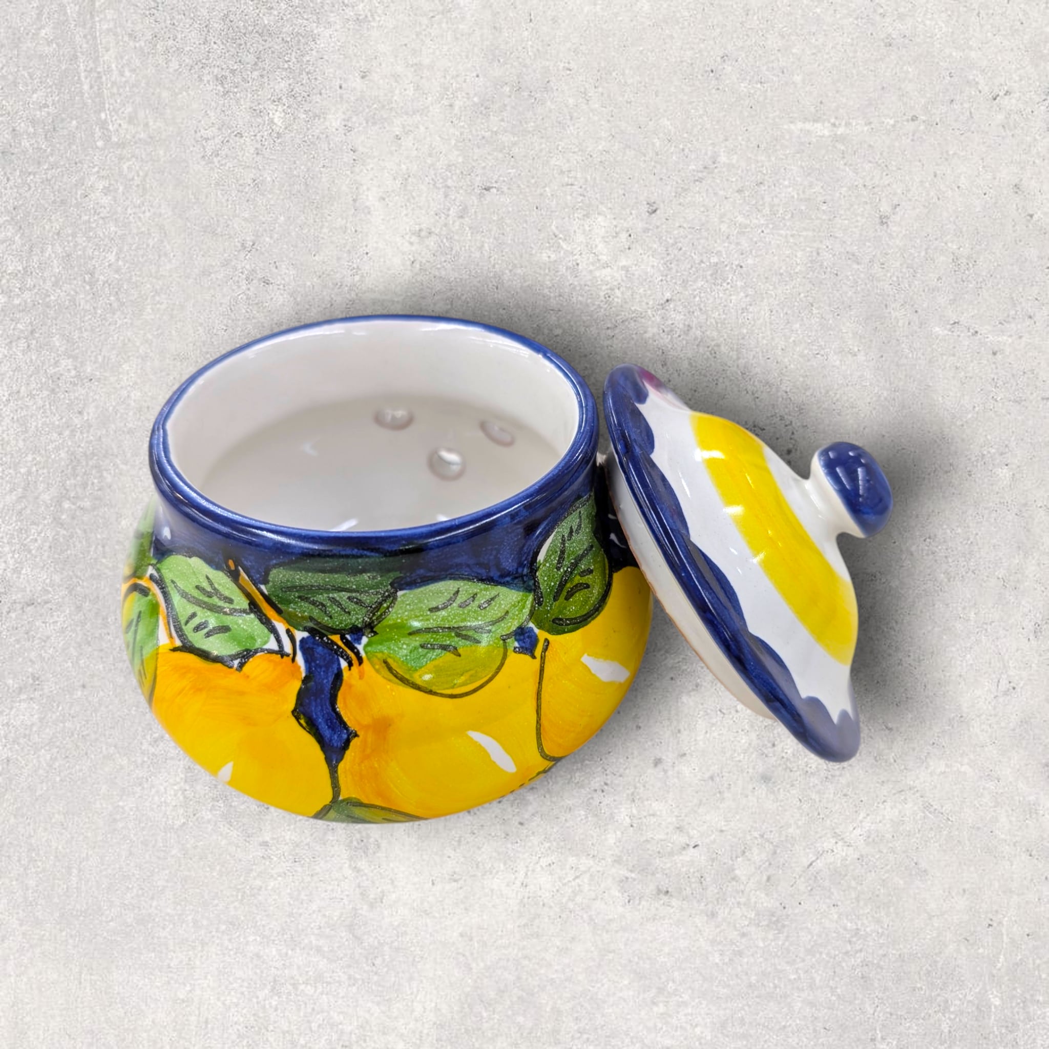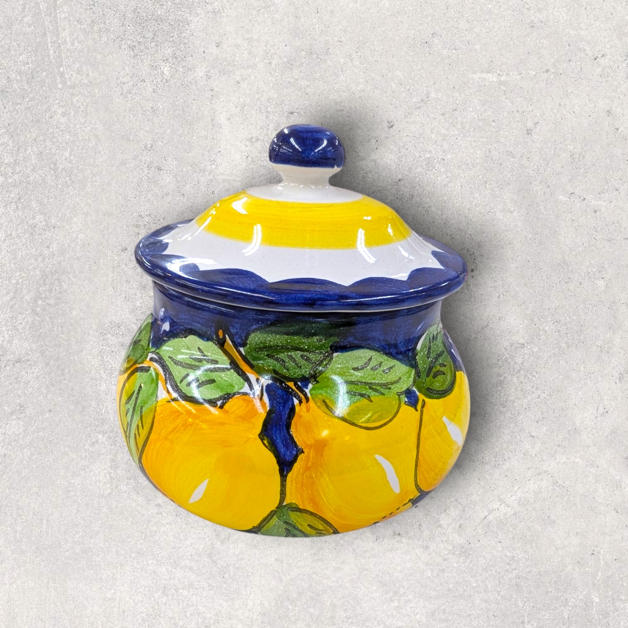 このポットには、紺地に元気いっぱいのレモンが大胆に描かれています!
